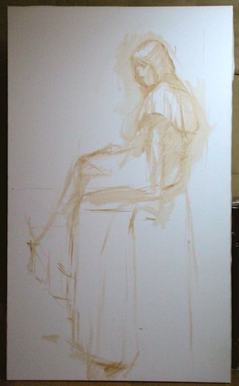 構図バランス、人物のプロポーションを注意しながらアタリをつけていきます。今回はバントアンバーでの描き出し。⇩