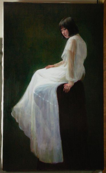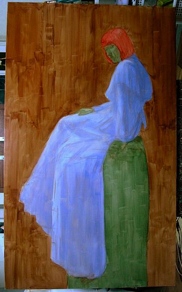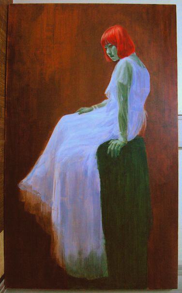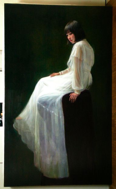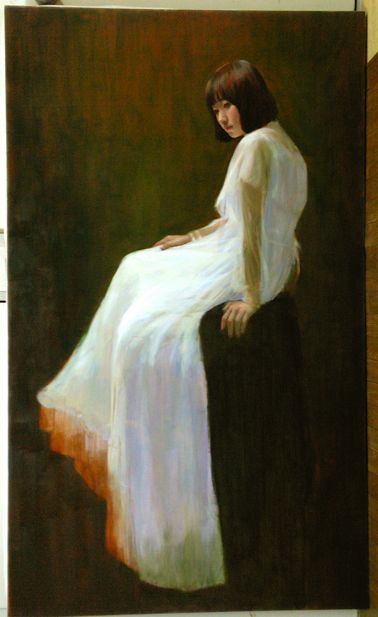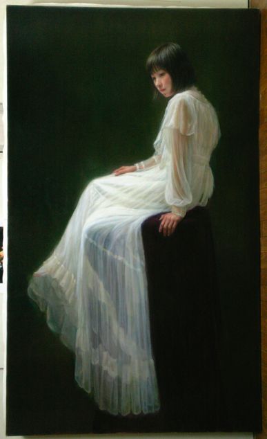 背景はハレーションを含むバックの色調と人物に対する空間感を意識して描いています。その後バックに対する関係性を視ながら肌色を整えます。(顔、右手、左手、足先それぞれの肌色と光の強さの違いを意識して)