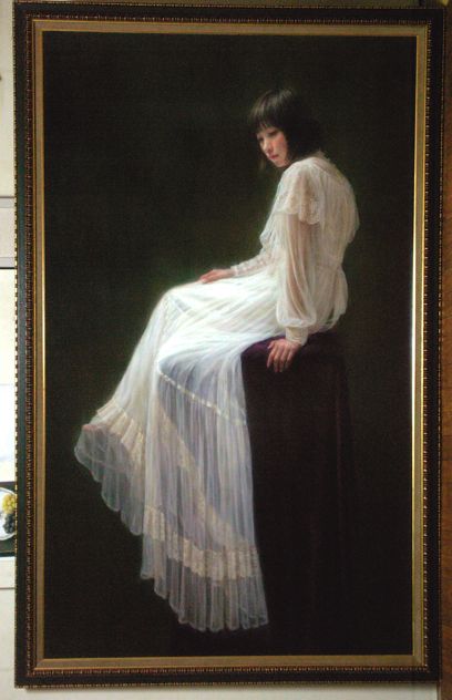⑪肌の露出している部分と衣装との進み具合にばらつきが出たため全体バランスを意識してここで衣装の描き込みを始めています。(説明的な描写をするのではなく、あくまでもレース地の透明感や柔らかさ等の美しさを重視します。※この段階から手前に垂れているスカートは峰を流れ落ちる河の様なイメージで描いています。)⇩
